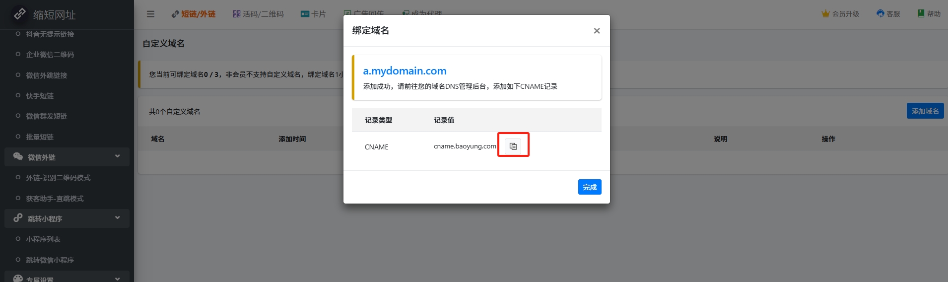 如下是阿里云注册备案域名流程,点击 注册完成后需求去备案域名,备案需要备案号,可以直接购买备案号(100元/个),或者购买最便宜的主机(99元/年)送5个备案号(推荐),根据备案流程完成备案 进入管理后台->专属设置-域名管理 输入你自有的域名(必须为阿里云备案域名),可以为二级子域名,这样可以不影响你原有的业务。例如你的域名为 mydomain.com,可以这里提交一个a.mydomain.com作为短链域名. 复制我们的CNAME,到阿里云配置 到阿里云域名列表,点击解析 设置CNAME记录 设置完成后,等待我们审核通过即可使用 如果需要设置SSL证书,请提供nginx证书给客服,等待我们技术配置, 查看如何获取SSL证书 如果你的域名不是阿里云注册备案的,请参照 阿里云备案帮助文档,或者联系阿里云客服备案