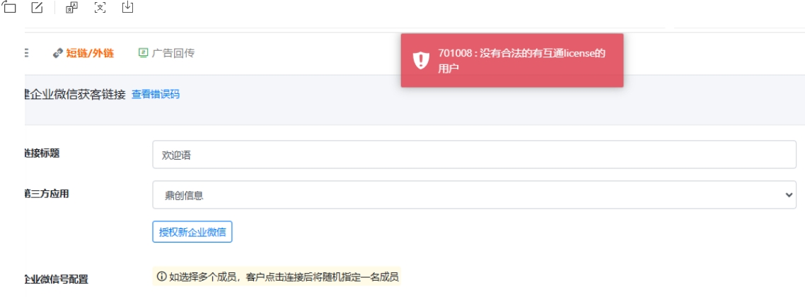 6. 服务商模式下,贴加企微获客助手链接时报“701008:没有合法的有互通license的用户”错误,导致无法添加用户